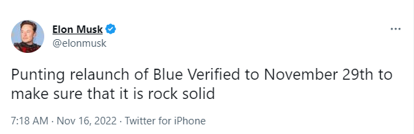 16 日消息,刚刚马斯克在推特发文称,将推特平台“蓝 V 认证”服务的重新启用推迟至 11 月 29 日,“以确保其坚如磐石”。