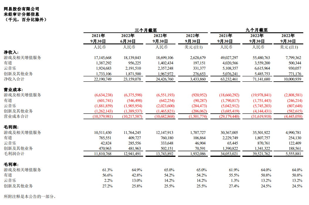 2022 年第三季度云音乐的毛利率为 14.2%,上一季度和去年同期分别为 13.0% 和 2.2%。其毛利率环比和同比改善主要由于前述原因。