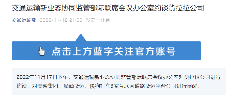 18 日消息,据交通运输部,11 月 17 日下午,交通运输新业态协同监管部际联席会议办公室对货拉拉公司进行约谈,对满帮集团、滴滴货运、快狗打车 3 家互联网道路货运平台公司进行提醒。