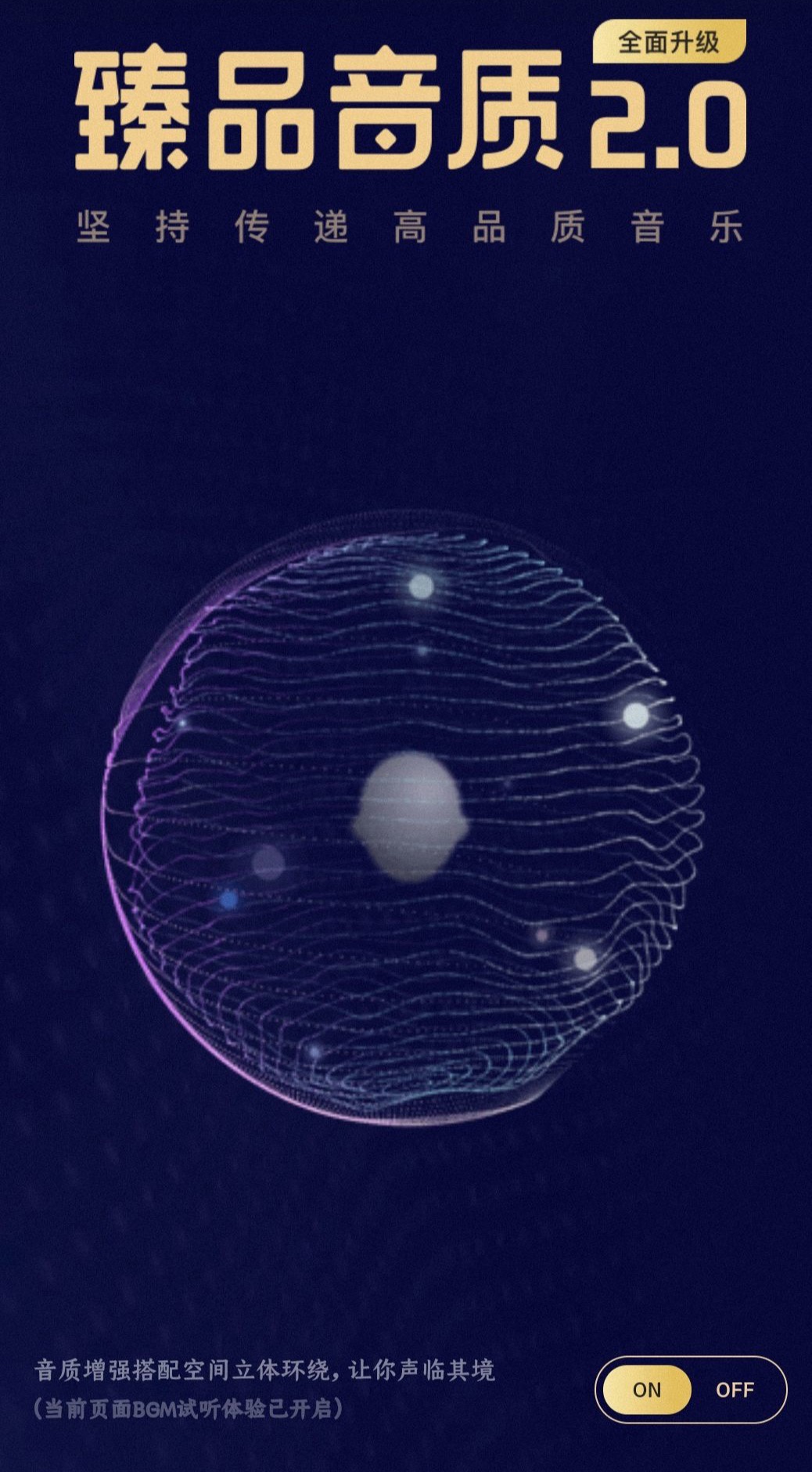 据官方介绍,臻品音质通过数字声音增强引擎进阶技术,极大程度提升原歌曲采样率(从普通的 44.1kHz 提升至 96kHz),突破传统 MP3 及 CD 品质的采样率限制,从而让用户听感更加清晰与生动。
