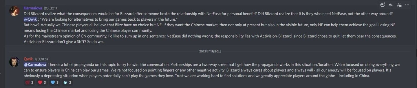 暴雪一直都很关心玩家 —— 我们所有的精力都集中在玩家身上。如果玩家们没办法玩到他们所喜欢的游戏恐怕会很难过,相信我们正在努力去寻找这个问题的解决方案,我们非常感谢全球玩家 —— 也包括中国(玩家)。