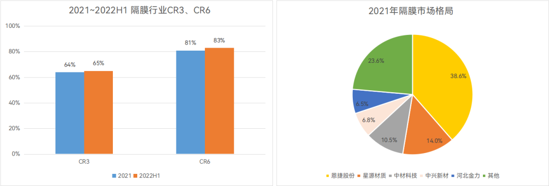 2021 年,中国锂电隔膜的前三名公司市占率(CR3)高达 64%,CR6 则为 81%;在 2022 年上半年,伴随着新增产线投产,行业集中度进一步提高,CR3 / CR6 分别提升至 65%/83% [12]。