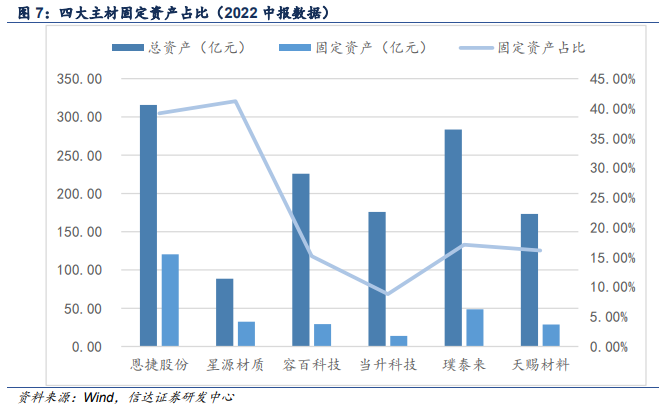 首先,电池隔膜是非常典型的重资产行业,固定资产占比显著高于其他电池主材。以信达证券整理的 6 家具有代表性的电池主材上市公司为例,隔膜制造商恩捷股份和星源材质的固定资产占比约为 40%,远远高于其它细分领域企业 [4]。