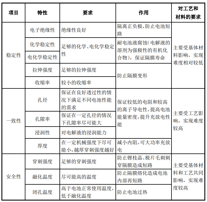 隔膜的技术含量很高,性能指标非常多。通常来说,高端薄膜产品具有合理的孔径大小及分布,可以降低内阻、熨平电流,有效保证电池能量密度和循环性能。安全性方面,抗穿刺强度和拉伸强度的提升可以增强材料的稳定性,加上良好的热稳定性及自发保护机制可以避免发生电池短路等风险事故。