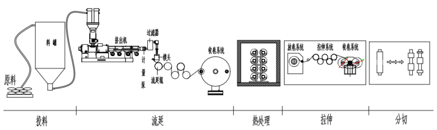 干法:又称熔融拉伸法,是指将高分子聚合物(主要为 PP)和添加剂原料混合制成熔融物,挤出流延后形成片晶结构,再经过热处理得到硬弹性的聚合物膜,在一定的温度下拉伸形成狭缝状微孔,热定型后制得微孔膜;