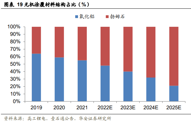 现阶段,无机涂覆隔膜占据绝大部分市场份额,占据统治地位,远远超过有机涂覆隔膜。高工产研锂电研究所数据显示,2021 年的涂覆隔膜出货中,95% 以上为无机涂覆;其中,勃姆石 2021 年实现出货量 1.8 万吨,同比增速 120%,渗透率已经超过 60% [8]。