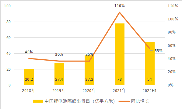 数据显示,2021 年中国中国锂电隔膜出货量 78 亿平米,同比增长超 100%;2022 年上半年锂电隔膜出货量 54 亿平米,同比增长超 55% [7](该统计口径仅计算基膜出货量)。
