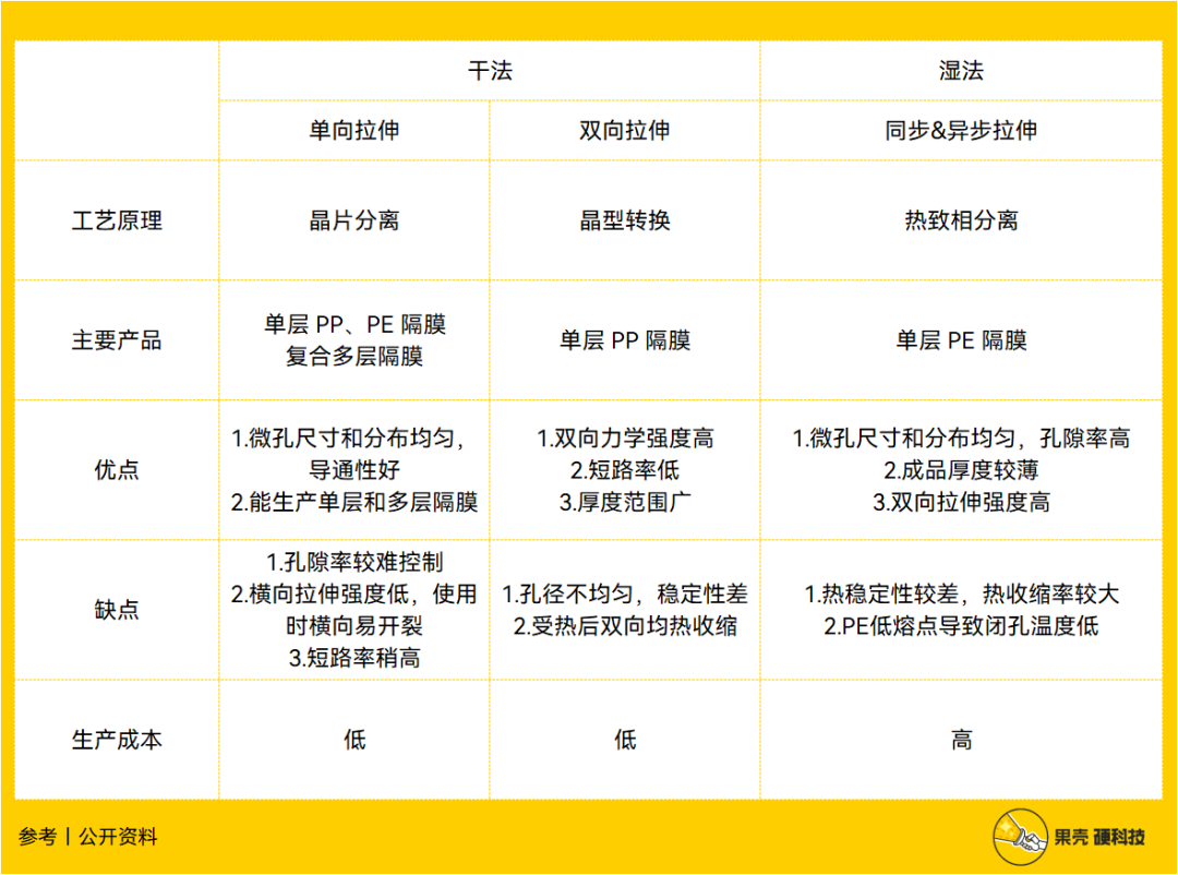 干法工艺的核心原材料为 PP,且生产设备的国产化已经基本完成,所以成本比较低,因几乎没有热收缩现象而具有较高的安全性,但最终产品的横向强度较差、微孔尺寸和分布不均匀,稳定性不高。干法隔膜适用于对成本敏感,但对能量密度要求不高的应用场景,譬如储能市场。双向拉伸由于只能生产单层隔膜,且各方面性能指标也不出众,下游用量很少,市占率很低。