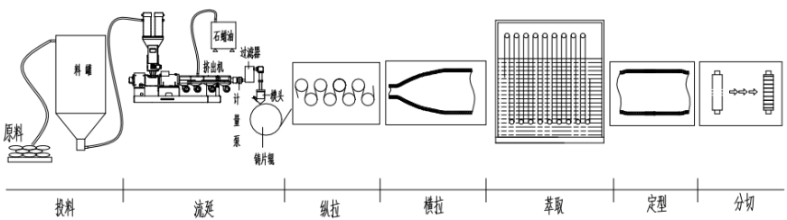 湿法:又称热致相分离法,是将高沸点小分子作为造孔剂(白油)添加到聚烯烃(聚乙烯 PE)中,加热熔融成均匀体系,由螺杆挤出铸片,经拉伸后用有机溶剂(二氯甲烷)萃取出造孔剂,再经热定型等工序得到微孔膜。