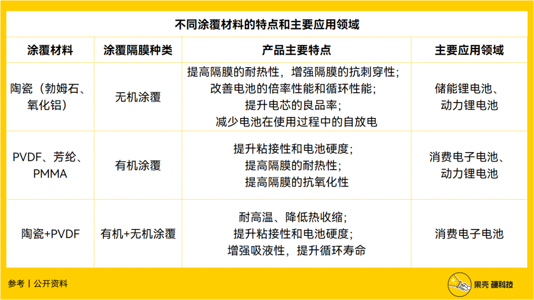 涂覆材料可分为无机和有机两大类,无机材料主要有陶瓷(勃姆石、氧化铝),有机材料主要有 PVDF、PMMA、芳纶等。无机材料的主要优势在于技术更为成熟,生产成本更低,性价比高,经济性较有机涂覆有明显优势;有机涂覆最大的优势就是产品性能好,但价格昂贵。