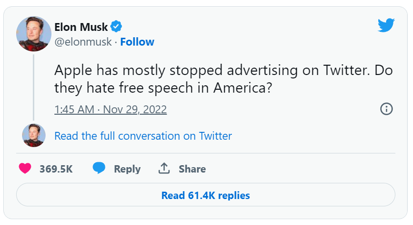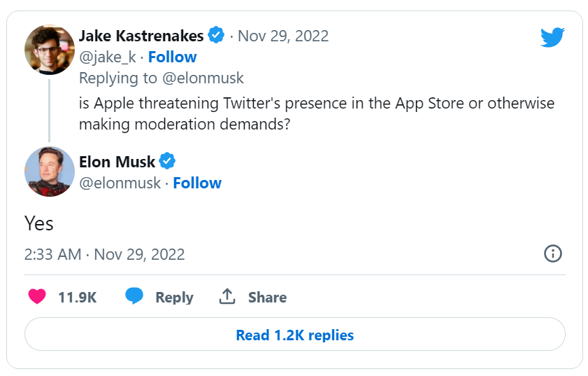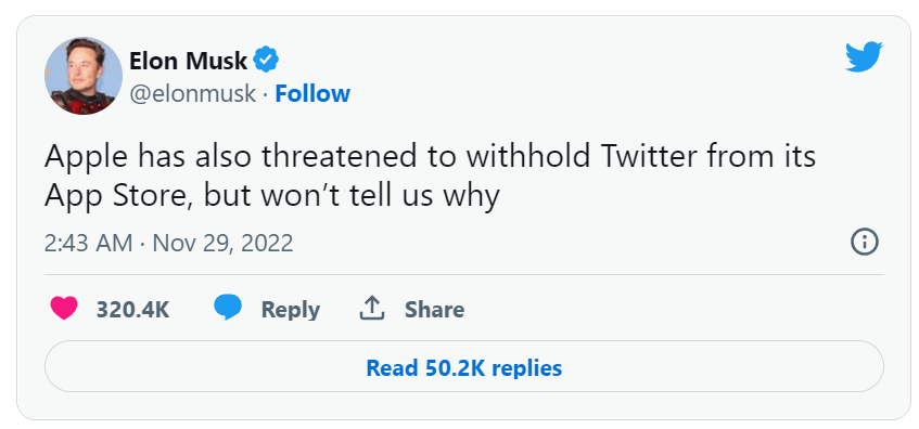 马斯克还称,“苹果还威胁将推特从 App Store 下架,但不告诉我们为什么这么做。”
