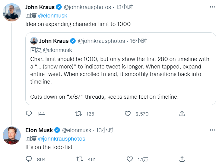 当地时间周日,有推特用户建议将每条推文的字符数上限从 280 个提高到 1000 个。随后,马斯克回复称:“这已经在待办事项清单上。”