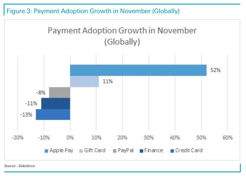 30 日消息,德意志银行分析师 Bryan Keane 在本周二发布的报告中,援引 Salesforce 的假期支出数据表示,苹果支付服务 Apple Pay 的采用率在这个假期以“极快的速度”增长,同比增长 52%。