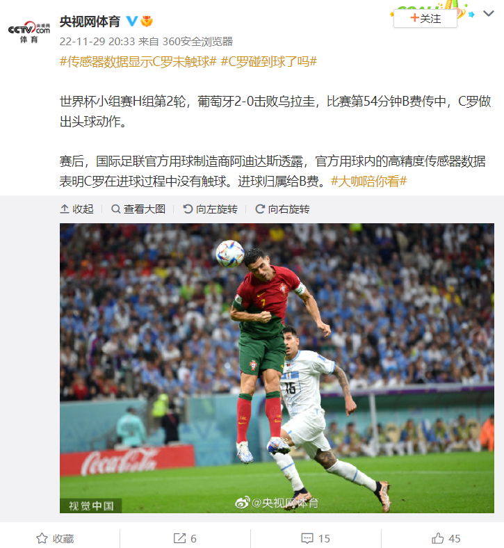 比赛第 54 分钟 B 费传中,C 罗做出头球动作。赛后,国际足联官方用球制造商阿迪达斯透露,官方用球内的高精度传感器数据表明 C 罗在进球过程中没有触球,进球归属给 B 费。