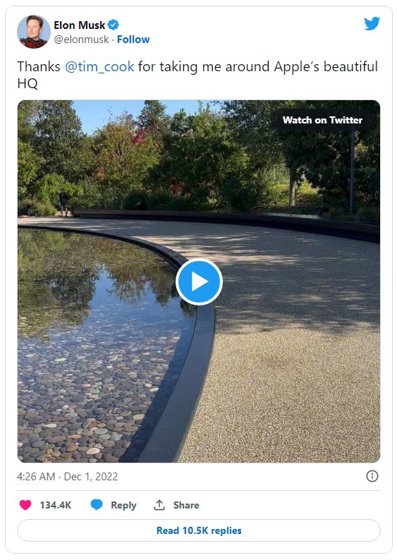 12 月 1 日消息,援引埃隆?马斯克(Elon Musk)更新的推文,这位现任的 Twitter 首席执行官今天造访了苹果总部 Apple Park,就 Twitter 争议和苹果 CEO 蒂姆-库克会面磋商。