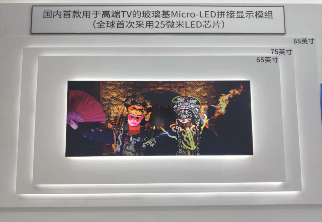 在大会上,成都辰显光电展示了 12.7 英寸 Micro LED 可拼接显示屏。这是国内首款用于高端 TV 的玻璃基 Micro-LED 拼接显示模组,全球首次采用 25 微米 LED 芯片。