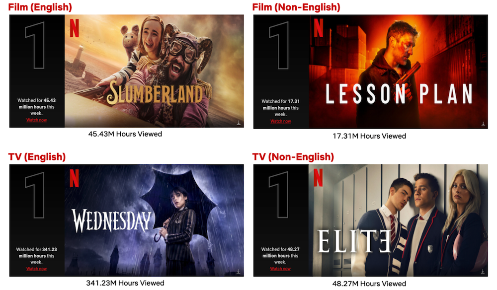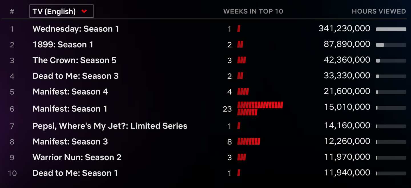 12 月 2 日消息,据 Netflix 官方消息,上周新剧《星期三(Wednesday)》以创纪录的 3 亿 4123 万小时的观看时长登榜首,有超过 5000 万的家庭观看了该剧集。