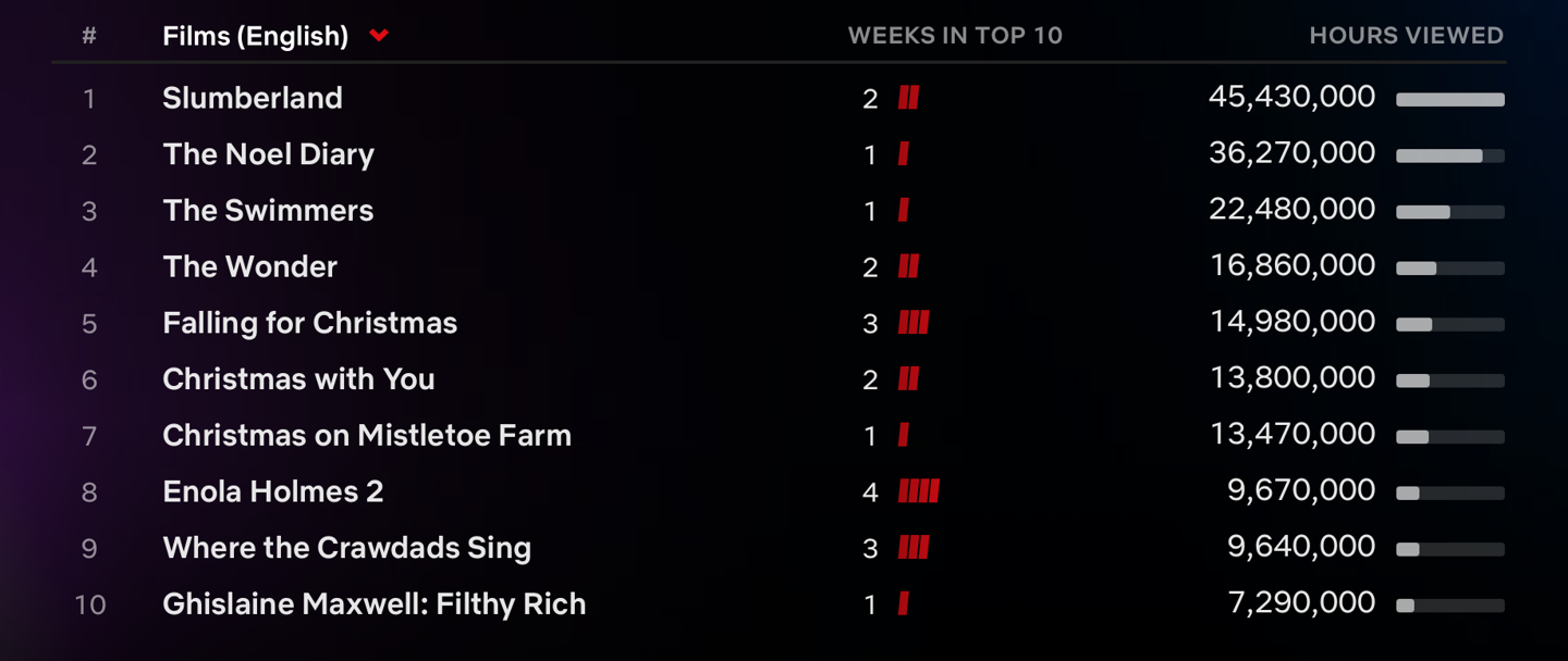 电影方面,家庭奇幻电影《沉睡之地》以 4543 万小时的观看时长登顶英语电影榜单。在短短 10 天内,近 4000 万家庭观看了这部电影。