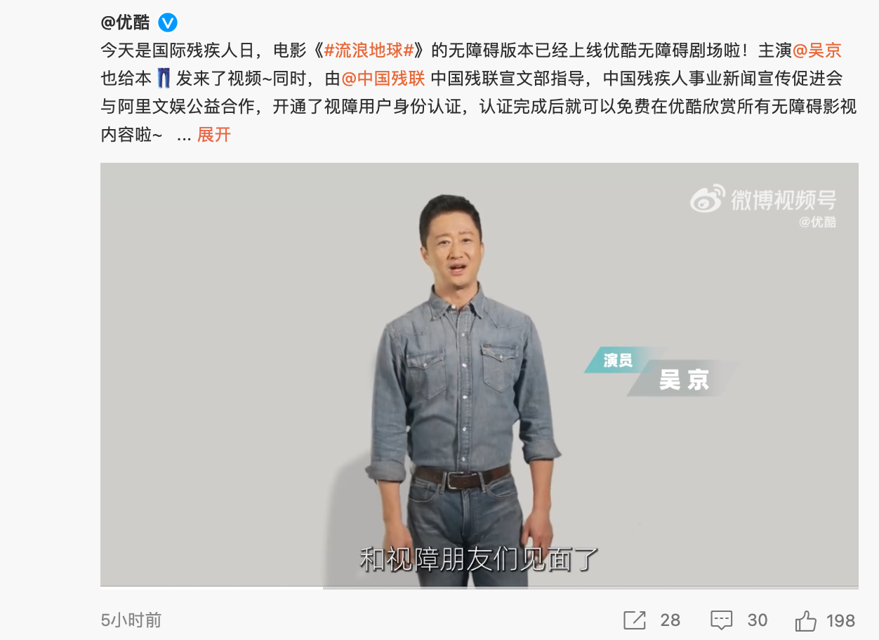 ,无障碍电影《流浪地球》、无障碍剧集《回廊亭》、《致勇敢的你》等作品已在优酷上线。目前,优酷平台无障碍视听作品总量已超过 100 部(集)。