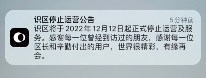 12 月 5 日消息,字节跳动旗下阅读工具 App“识区”发布停止运营公告,将于 2022 年 12 月 12 日起正式停止运营及服务。