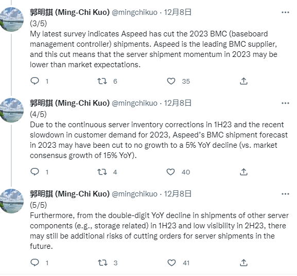 另外,郭明錤调查显示,信骅已下修 2023 年 BMC (基板管理控制器) 出货量。因信骅是 BMC 领导厂商,此砍单意味着服务器在 2023 年出货动能可能低于市场预期。