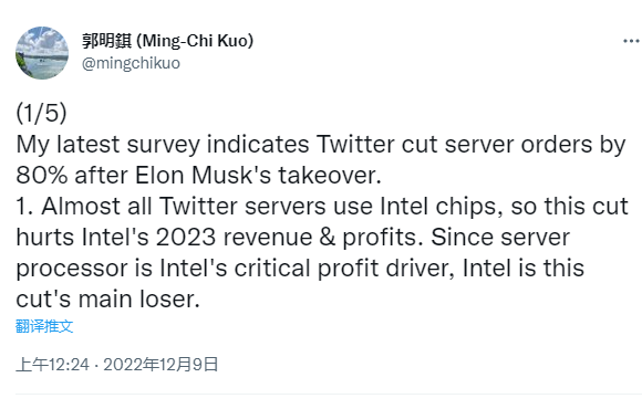 郭明錤称,Twitter 服务器几乎都采用 Intel 的处理器,故此砍单不利于 Intel 2023 年的营收与利润。因服务器处理器是 Intel 关键利润驱动,故 Intel 为此砍单的主要输家。