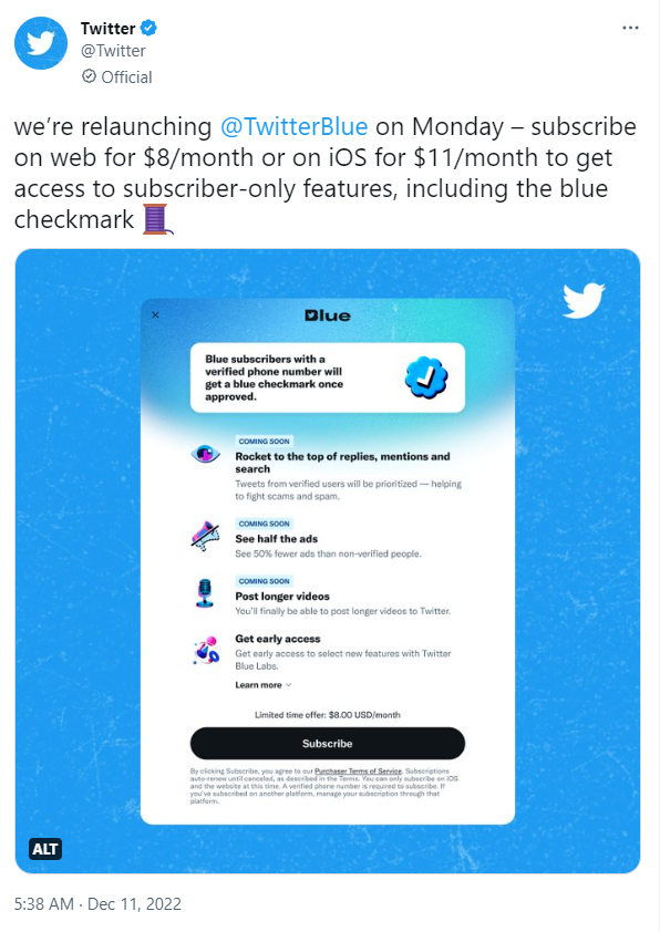 12 月 11 日消息,Twitter 今天宣布,其 Twitter Blue 订阅服务将于周一重新启动,该服务在网页端的订阅价格为 8 美元 / 月,通过其 iOS 应用的订阅价格为 11 美元 / 月。在 iOS 上的较高价格有助于抵消苹果从通过 App Store 支付的订阅费用中获得的 15% 至 30% 的提成,Twitter 老板埃隆-马斯克曾批评这一费用过高。