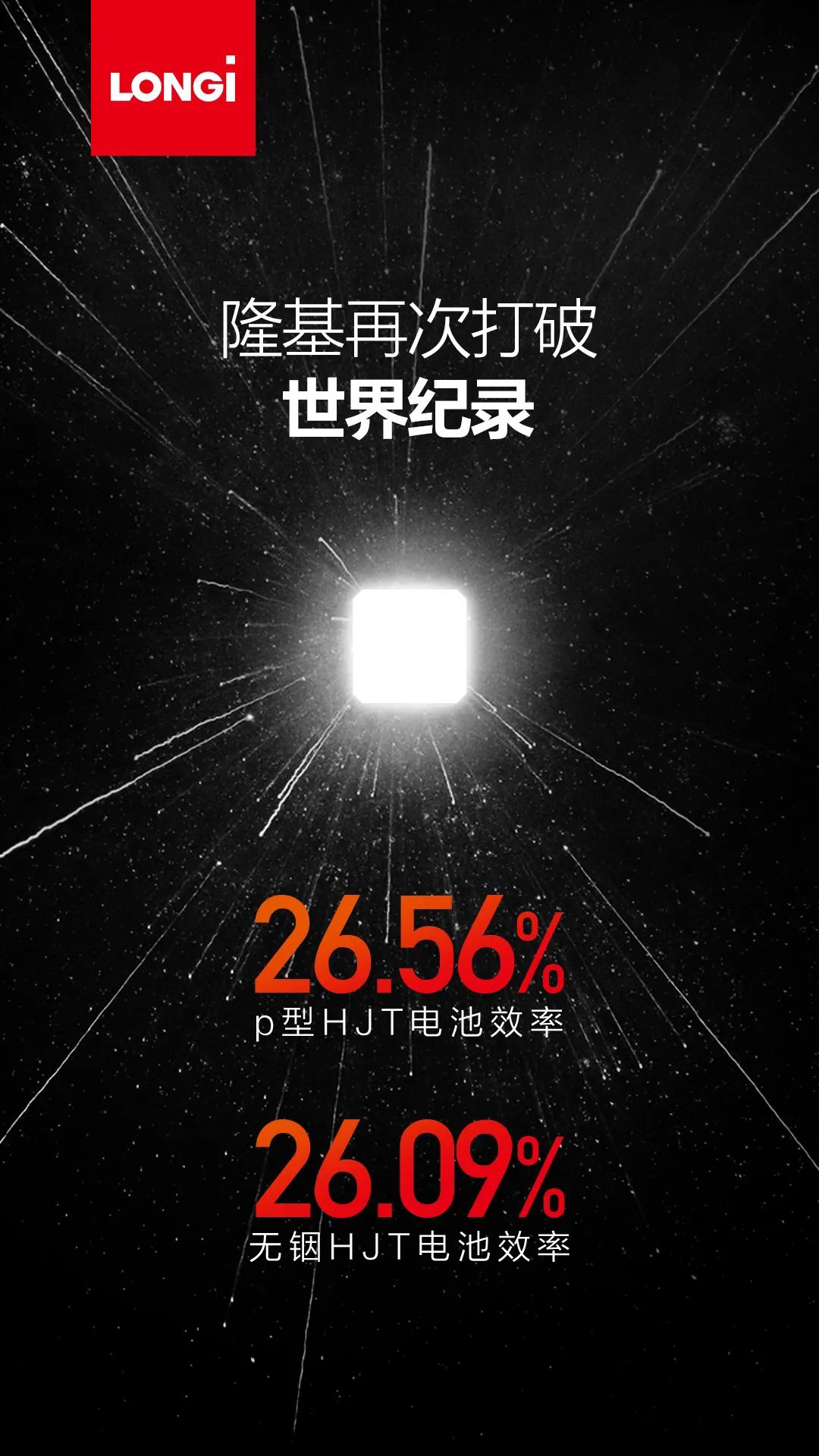 隆基绿能表示,针对 HJT 电池长期以来的痛点问题,公司研发团队成功在隆基商用掺镓硅片上实现了 26.56% 的转换效率,较今年 9 月公布的 26.12% p 型 HJT 电池效率又提升了 0.44%,再次刷新 p 型晶硅电池效率的最高纪录。