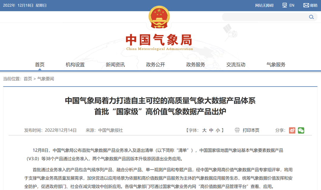 12 月 18 日消息,据中国气象局网站,中国气象局 12 月 8 日公布首批气象数据产品业务准入及退出清单(以下简称“清单”)。
