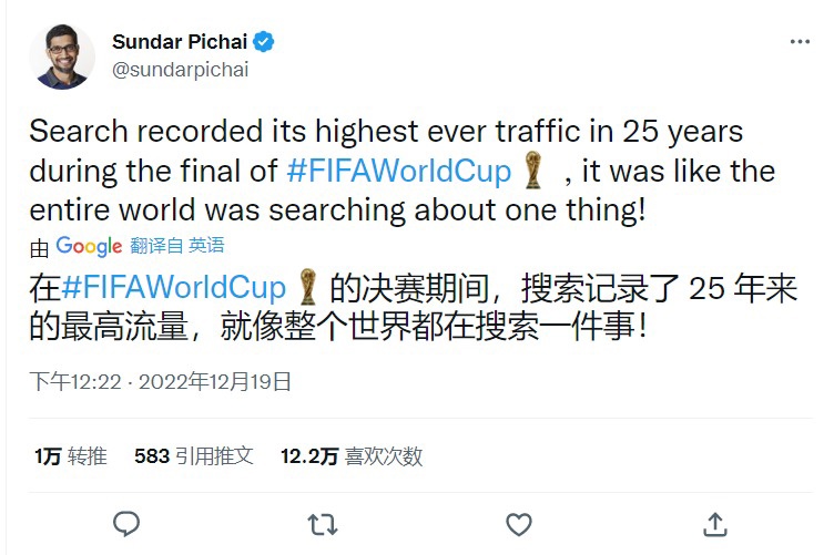 谷歌 CEO:卡塔尔世界杯相关搜索刷新了谷歌成立 25 年以来的流量纪录