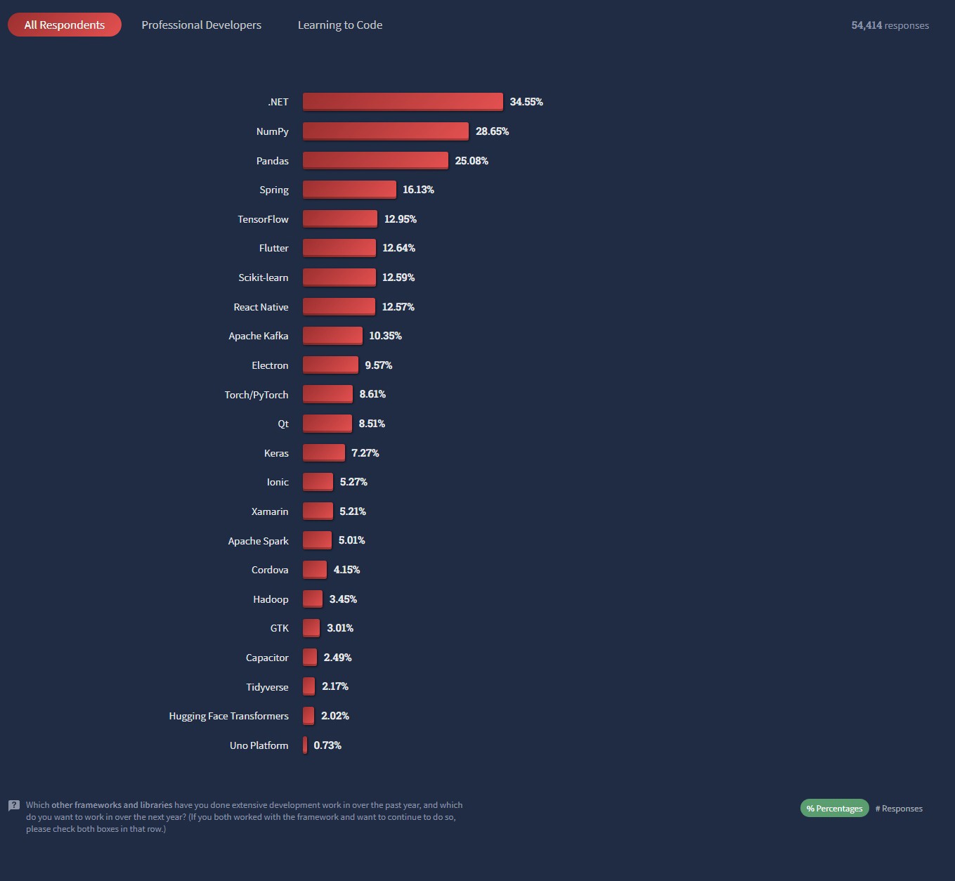 最受欢迎的开发者框架是微软.NET,使用率为 34.5%,其次是 NumPy(27%),Pandas(25%),Spring(16%),TensorFlow(13%),和 Flutter(12.6%)。