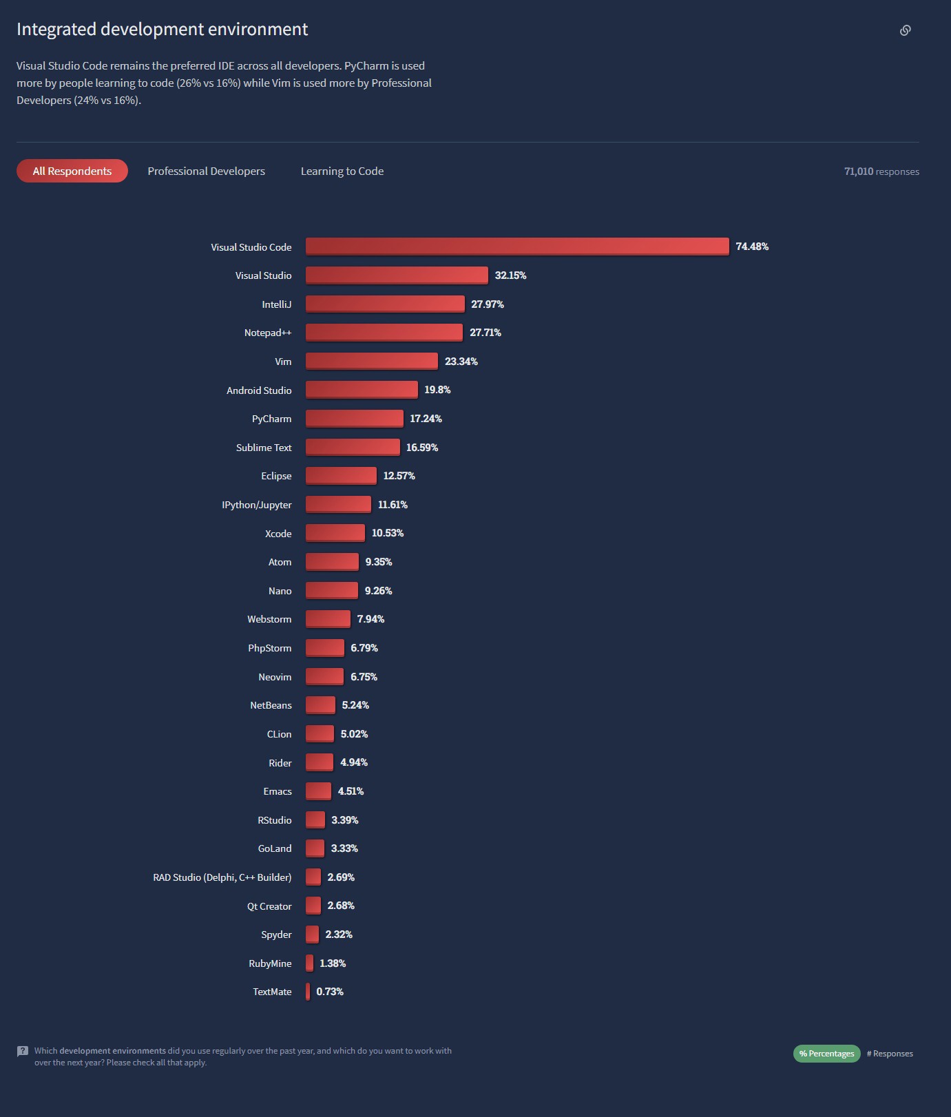 在实际的开发者技术方面,微软 Visual Studio Code 是迄今为止最受欢迎的集成开发环境(IDE),使用率为 75%,其次是微软 Visual Studio(32%)、IntelliJ(28%)、Notepad++(28%)、Vim(23%)和 Android Studio(20%)。(苹果的 Xcode 以 10.5% 的比例排在非常遥远的第 11 位)。