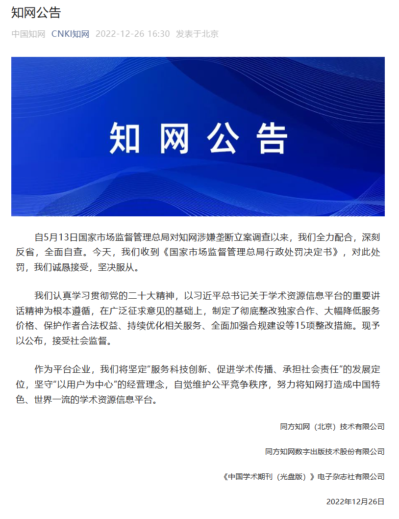 对此,CNKI 知网发布公告,对该处罚决定,知网诚恳接受、坚决服从。按照行政处罚决定,结合社会各方面的意见和建议,知网制定了以下五个方面共 15 项整改措施,现对外公开,接受各方监督。