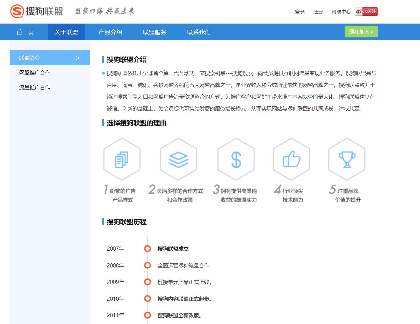 2007 年,搜狗网盟成立,其致力于通过搜索引擎入口和网盟广告流量资源整合的方式,为广告客户和网站主带来推广效益的最大化。彼时,搜狗联盟是与百度、淘宝、腾讯、谷歌网盟齐名的五大品牌,同时也是业界收入和分成增速最快的网盟之一。