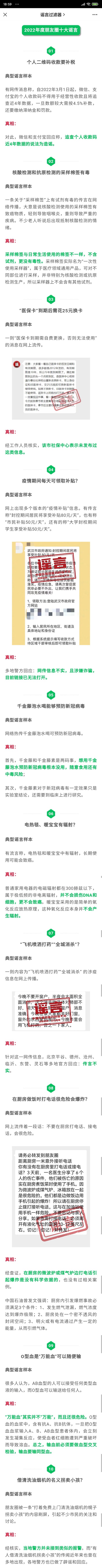 2022 年度朋友圈十大谣言包括:个人二维码收款要补税,核酸检测和抗原检测的采样棉签有毒,“医保卡”到期后需花 25 元换卡,疫情期间每天可领取补贴?千金藤泡水喝能够预防新冠病毒,电热毯、暖宝宝有辐射?“飞机喷洒打药”“全城消杀”?在厨房做饭时打电话很危险会爆炸?O 型血是 "万能血" 可以随便输,借清洗油烟机的名义拐卖小孩?等等。