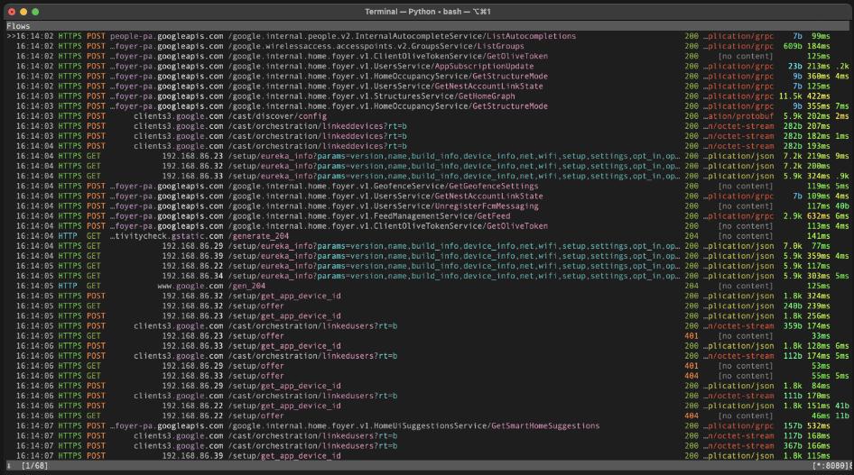 昆茨通过 Nmap 扫描,找到了 Google Home 本地 HTTP API 的端口。于是他设置了一个代理来捕获加密的 HTTPS 流量,希望劫持用户授权令牌。