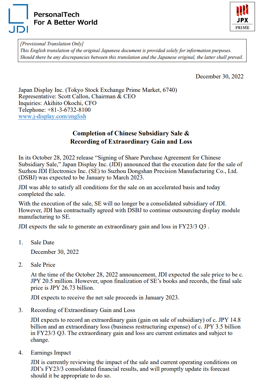 ,JDI 在 10 月宣布该消息时预期出售价仅有 205 亿日元,但在完成苏州 JDI 电子的账务和纪录后将价码提高至 267.3 亿日元。JDI 预计将在 2023 年 1 月收到这笔款项。
