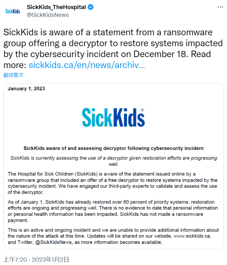 多伦多儿童医院(SickKids)官推承认了 LockBit 的这一声明,并表示正在与外部安全专家合作“验证和评估解密工具的使用”。