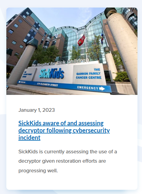 2022 年 12 月 18 日,多伦多儿童医院(SickKids)遭到勒索软件攻击,导致该机构无法访问许多关键系统。该事件导致患者等待时间增加。截至 12 月 29 日,SickKids 表示已重新获得近 50% 的优先系统的访问,包括导致诊断和治疗延误的系统。