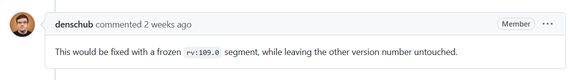 ,Firefox 开发者已将 rv:110.0 进行冻结,目前暂时使用 rv:109.0 进行替代,等到 Firefox 120 版本(rv:120.0)就不会有这个问题了,也就是 2023 年 9 月 25 日 Firefox 120 版本发布之后。