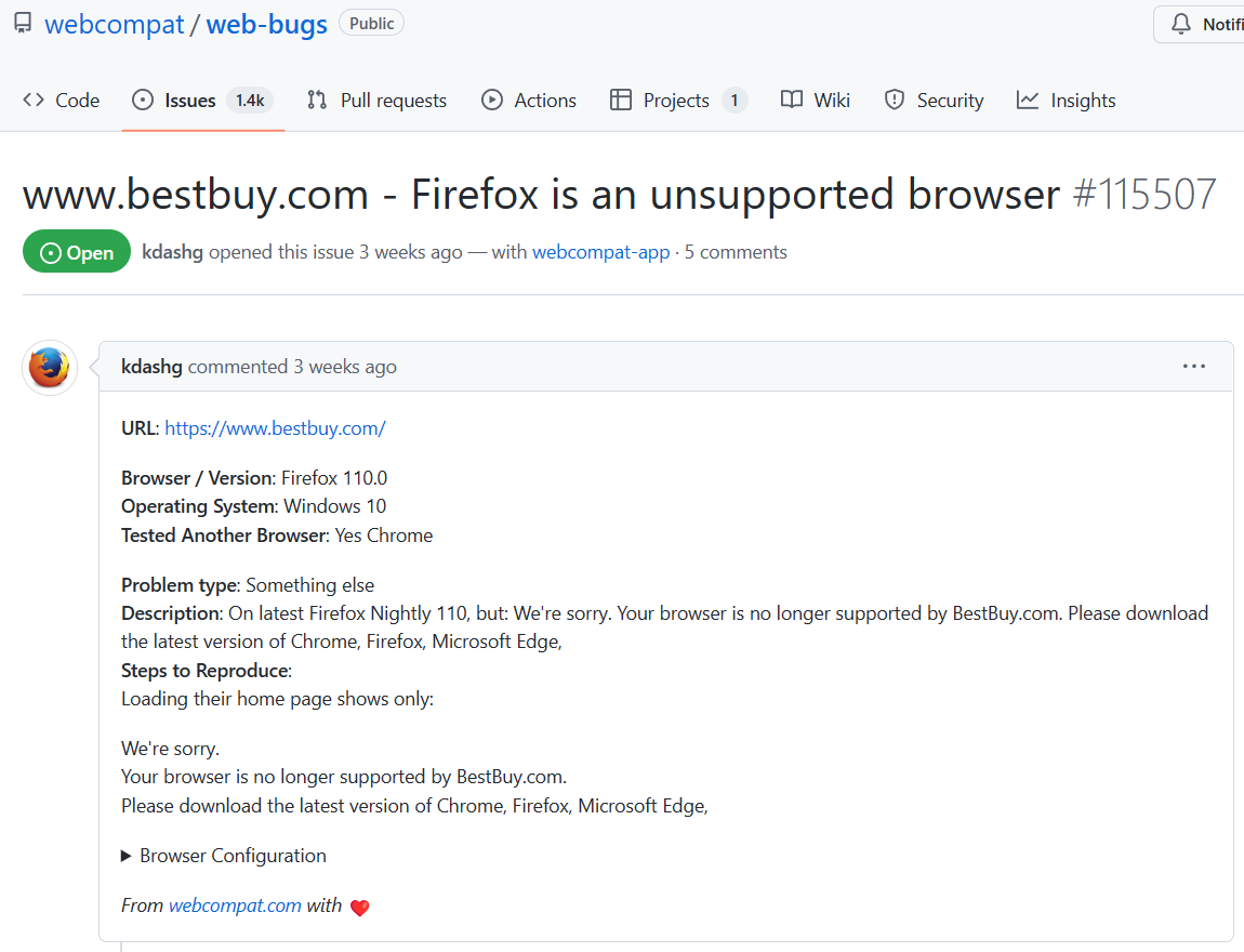 1 月 3 日消息,根据用户向 Mozilla 的 Bug 反馈,Firefox 110 火狐浏览器遇到了一个奇怪的问题,在访问 BestBuy.com 时显示“不再支持您的浏览器,请下载最新版本的 Chrome、Firefox、Microsoft Edge”。