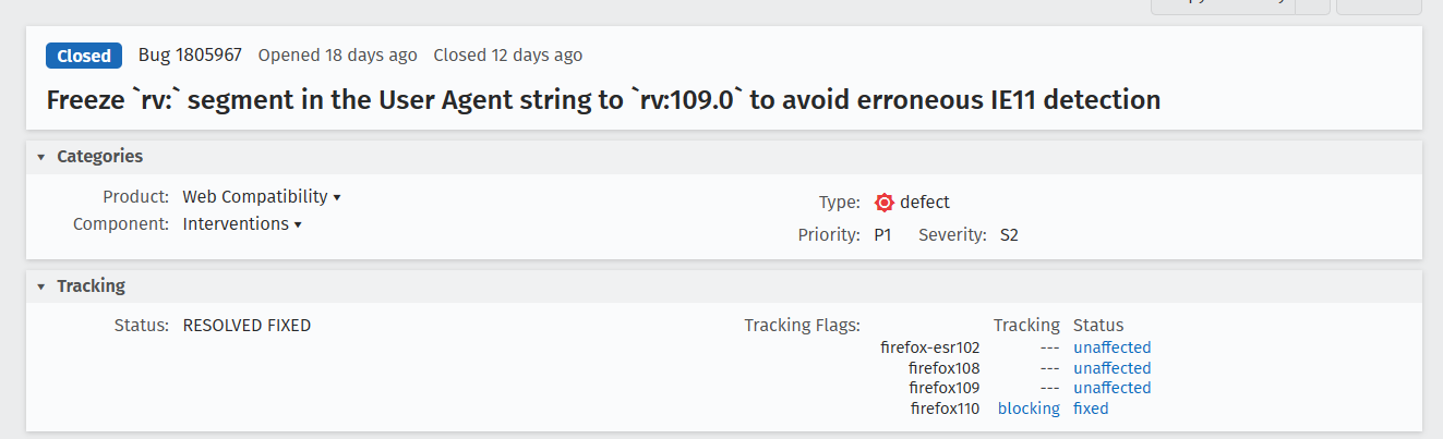 部分网站在检测浏览器是否支持时,只检测 rv:11* 是否匹配,也就是 rv:110.0 和 rv:11.0 被视为相同内容,因此 Firefox 110 被当成了微软 IE 11,出现了这一奇怪问题。