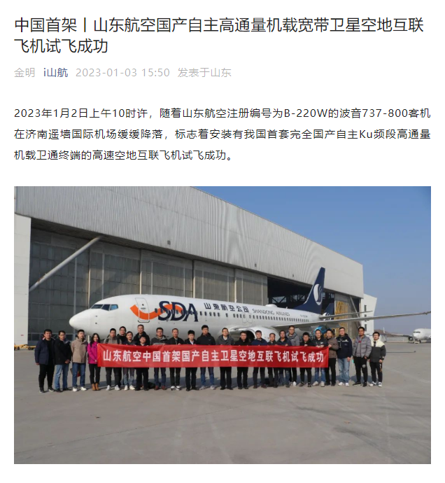 3 日消息,据山东航空集团有限公司 3 日发布消息称,1 月 2 日,该集团注册编号为 B-220W 的波音 737-800 客机在济南遥墙国际机场降落,标志着装有中国首套完全国产自主 Ku 频段高通量机载卫通终端的高速空地互联飞机试飞成功。