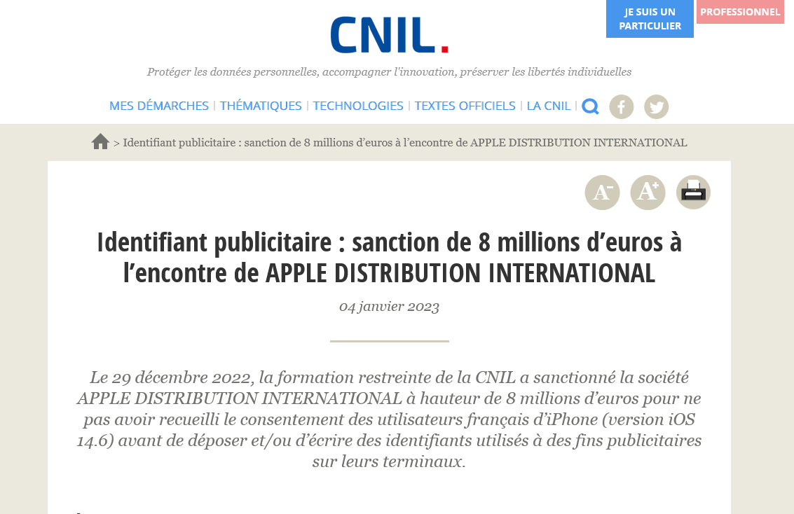 苹果默认收集信息并将这些数据用于广告,CNIL 认为用户必须采取“大量行动”才能在“设置”应用的“隐私”部分关闭广告。因此,CNIL 裁定苹果公司违反了《数据保护法》第 82 条,并被处以 800 万欧元的罚款。