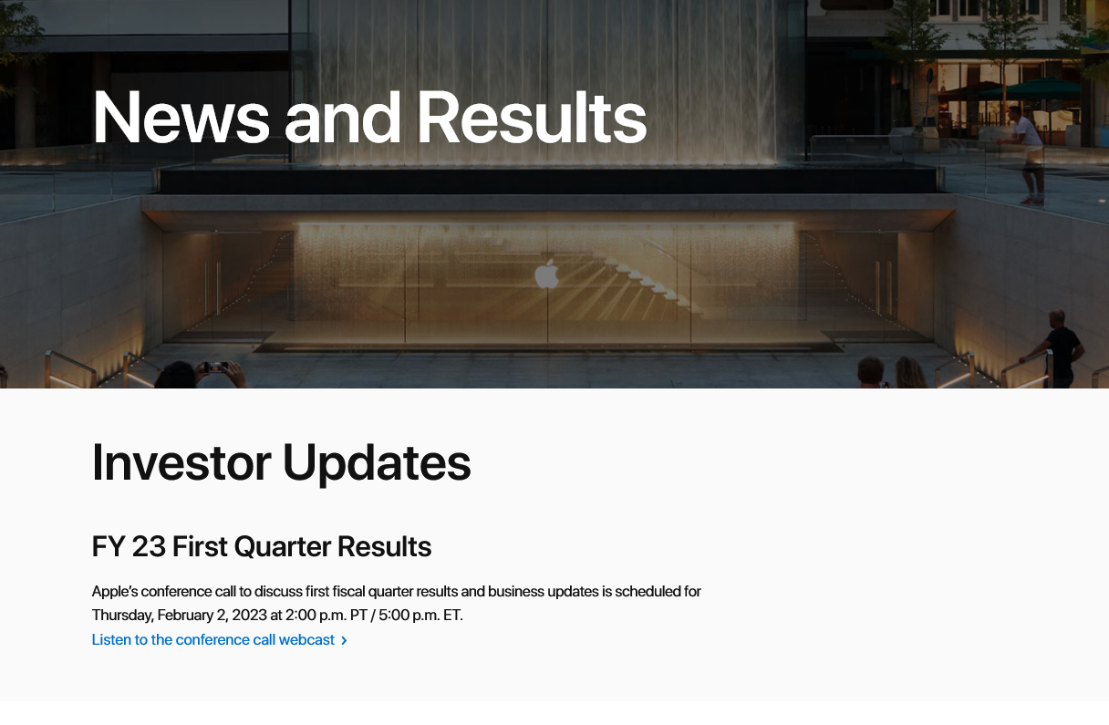 5 日消息,苹果今天更新了投资者相关页面,表示将于今年 2 月 2 日公布 2023 财年第 1 财季(按照日历来算是 10-12 月的 2022 年第 4 季度)的财报。