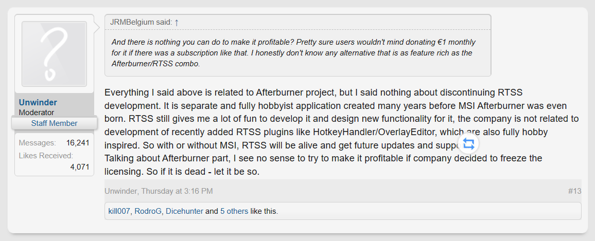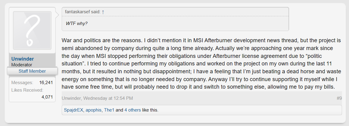自微星停止履行其在 Afterburner 许可协议下的义务之日起,已经接近一年了。在过去的 11 个月里,我试图继续履行我的职责并独自完成该项目,但结果却让我失望。我有一种感觉,我只是在白费力气,把精力浪费在公司不再需要的事情上。无论如何,我会在有空闲时间的时候自己继续支持它,但可能需要放弃它并转向其他东西,这样我才能维持生活。