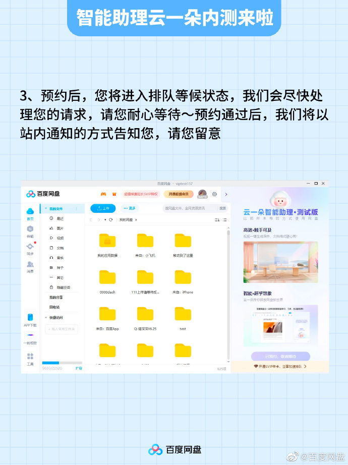 5 月 27 日消息,百度网盘宣布“云一朵”智能助理开启内测,可通过百度网盘 PC 客户端(最新版)或网页版进行预约。