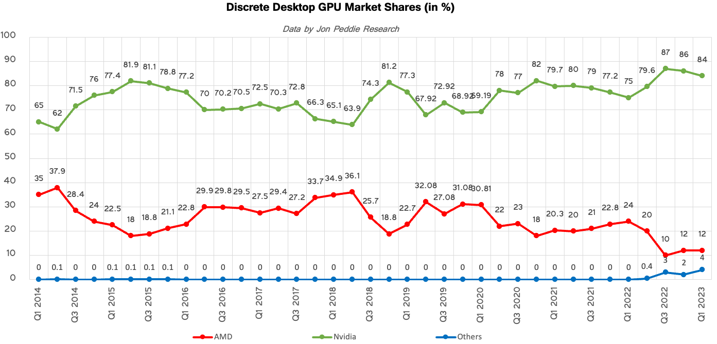 Nvidia 的季度单位出货量下降了 15.2%。英伟达继续以 83.7% 的市场份额占据主导地位。