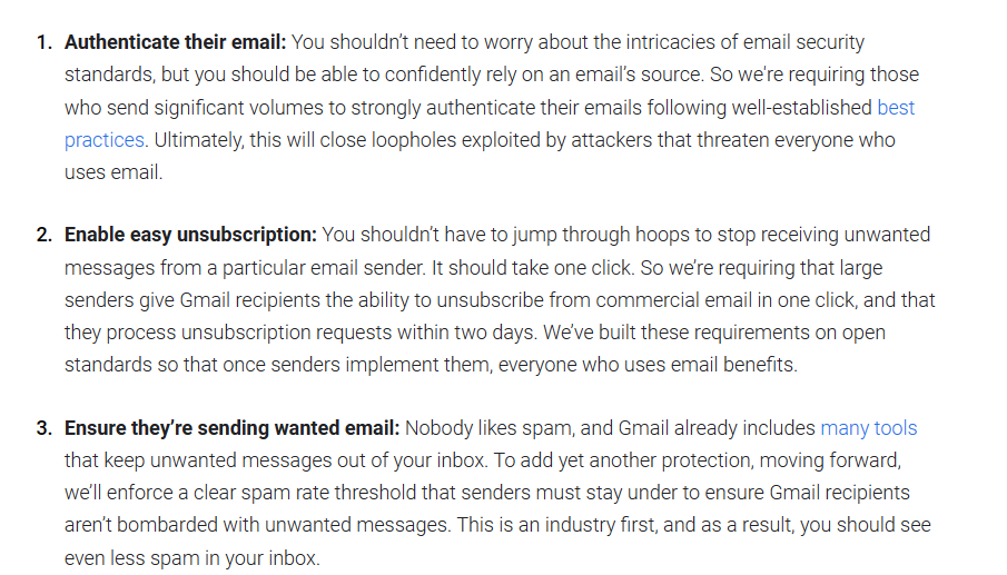 谷歌认为 Gmail 邮箱用户必须能够在相关邮件中“一键取消订阅”,若这批“大量邮件发送者”发送的邮件中“取消订阅”功能并不清晰明朗,谷歌也会拦截相关邮件。由于谷歌是采用开放标准来建立此类要求,因此不管是使用 Gmail 或其它邮件服务的用户,都能从谷歌这一要求受益。