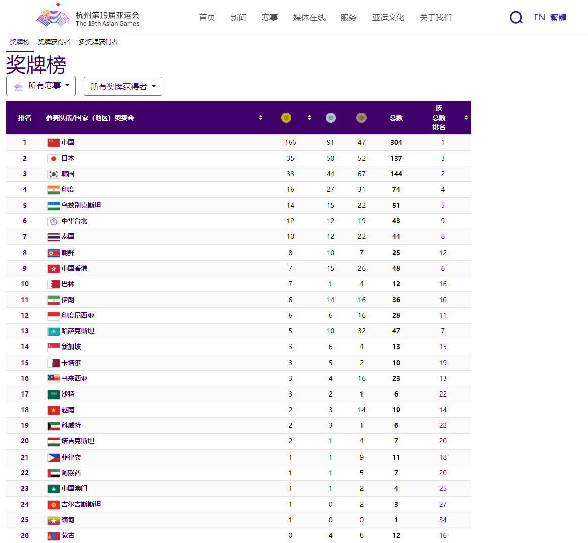 截至IT之家发稿,参赛的 36 个国家和地区中已经有 25 个拿到了金牌,中国以 166 枚金牌、91 枚银牌、47 枚铜牌遥遥领先于第二名日本以及第三名韩国。